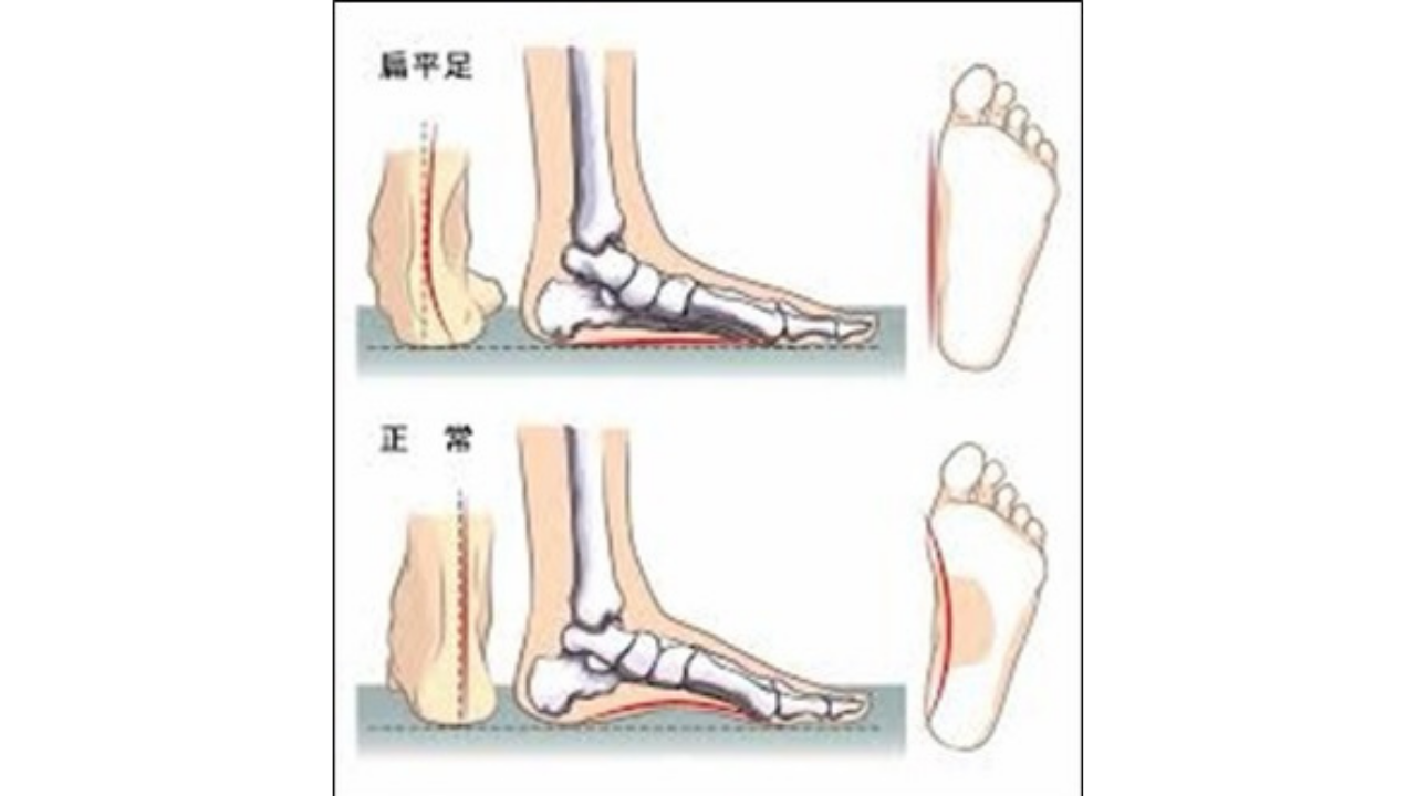 ふくらはぎやスネの筋肉が硬くなると、足首がねじれ土踏まずが低くなり扁平足になります。